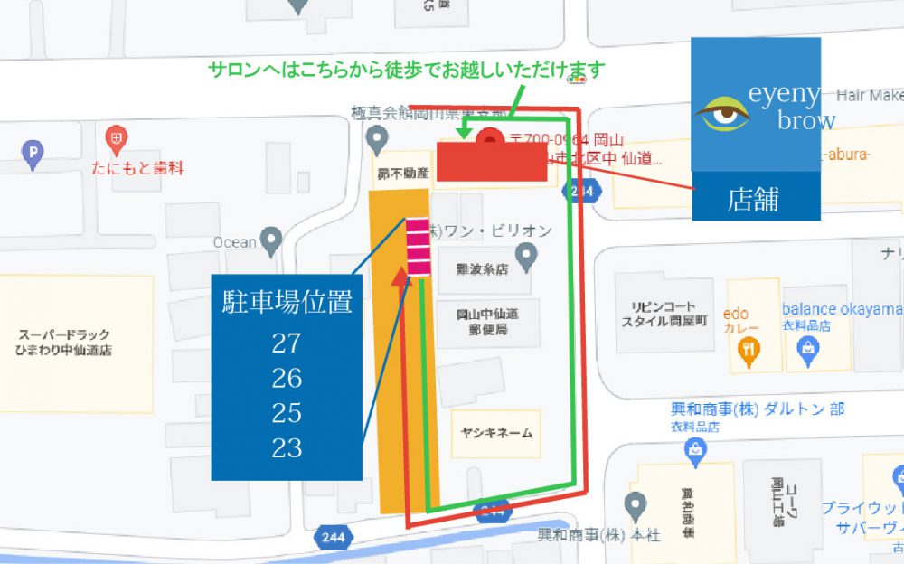 また駐車場内に同じ番号の駐車場位置がありますが、必ず「eyenybrow」看板のある番号位置へ駐車をお願い致します。
